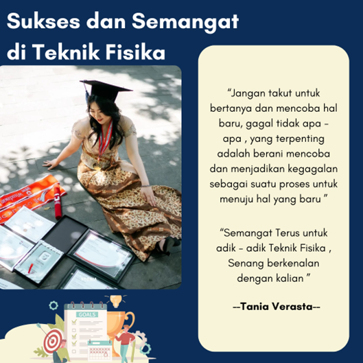 Adapun Pesan yang Tania sampaikan untuk Adik – Adik di Teknik Fisika Jangan pernah takut untuk bertanya dan mecoba hal baru. Tentukan tujuan adik – adik selama perkuliahan, berusaha untuk mencapai tujuan yang diinginkan. Gagal tidak apa – apa, jadikan kegagalan tersebut sebagai jembatan untuk menuju keberhasilan.