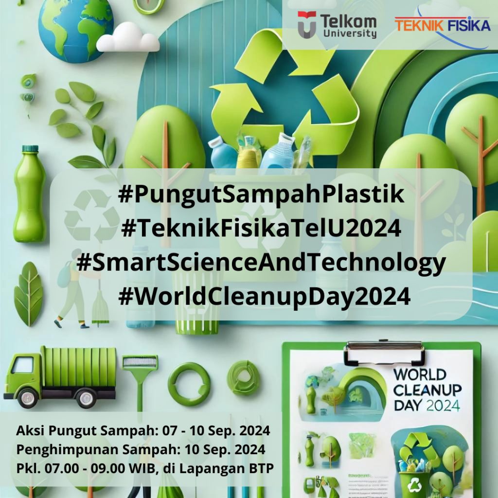 Program Studi S1 Teknik Fisika, Universitas Telkom akan menggelar peringatan World Cleanup Day 2024 melalui kegiatan Aksi Pungut Sampah Plastik. Acara ini bertujuan untuk meningkatkan kesadaran lingkungan dan mengambil tindakan nyata dalam mengurangi sampah plastik, yang menjadi salah satu masalah lingkungan terbesar di dunia.